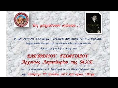 Πνευματική εκδήλωση μνήμης " Εις μνημόσυνον αιώνιον..." δια Ελευθέριον Γεωργιάδην. Μουσικο-φιλολογικό πνευματικό μνημόσυνο, επί τη συμπληρώσει ενός έτους από της εις Κύριον εκδημίας του, δια τον αείμνηστο Ελευθέριο Γεωργιάδη, Άρχοντα Λαμπαδάριο της Μ.Χ.Ε, διοργανώνει ο Εν Αθήναις Σύλλογος Μουσικοφίλων Κωνσταντινουπόλεως, δια να τιμήσει την μνήμην του αλήστου μνήμης ιεροψάλτου, χοράρχου και διδασκάλου πολλών εκ των μελών της χορωδίας του Συλλόγου.